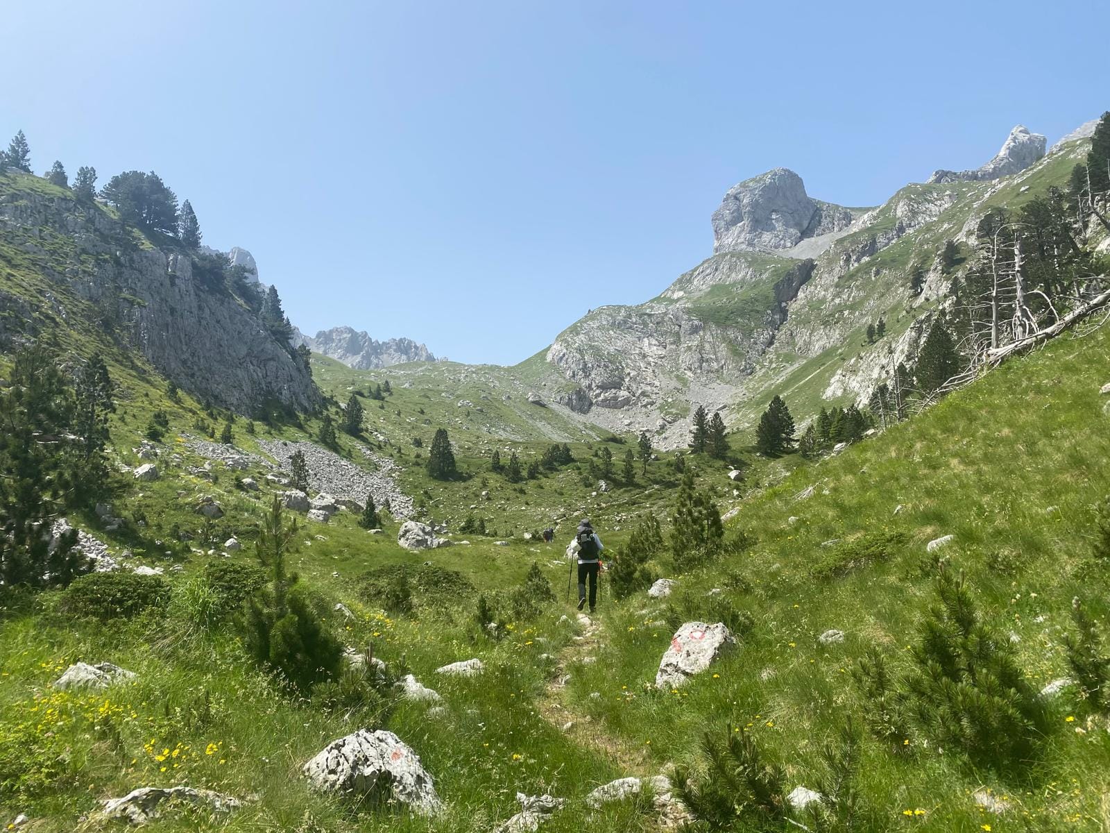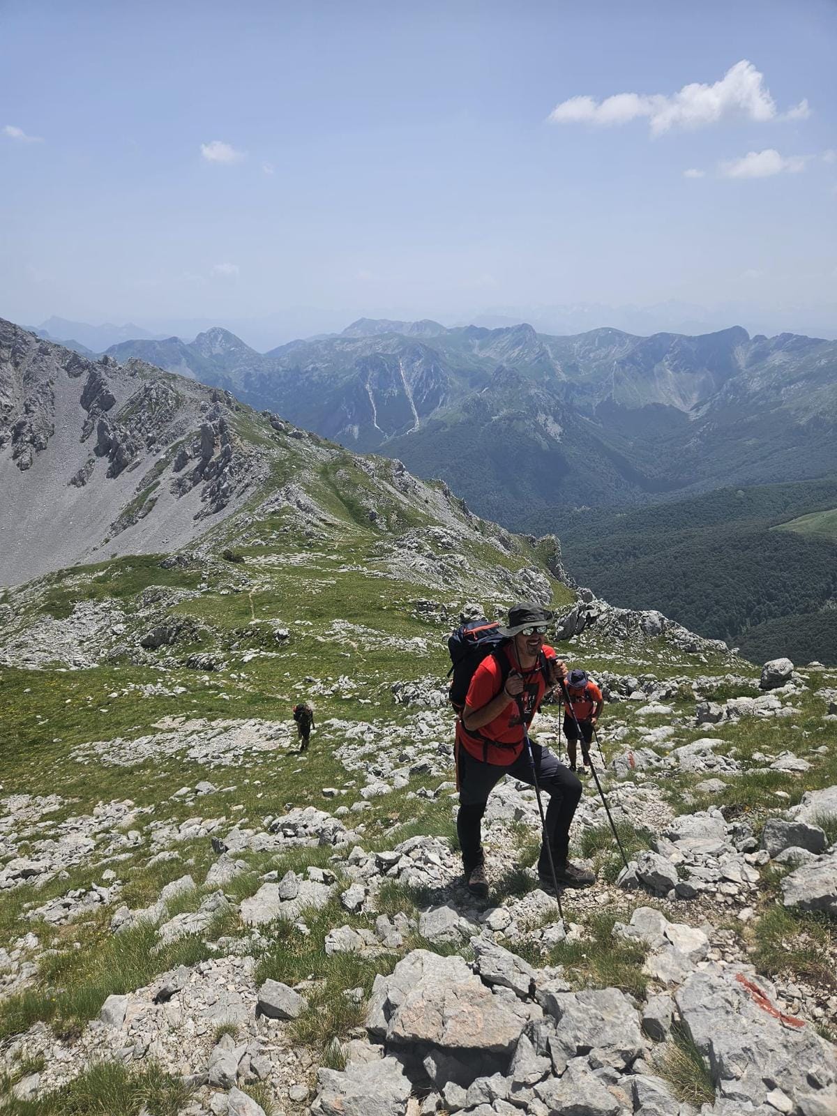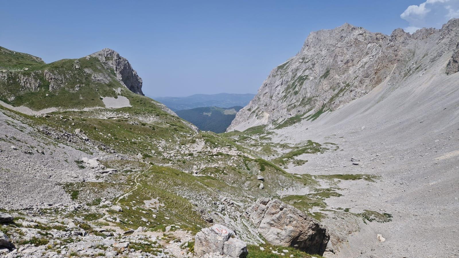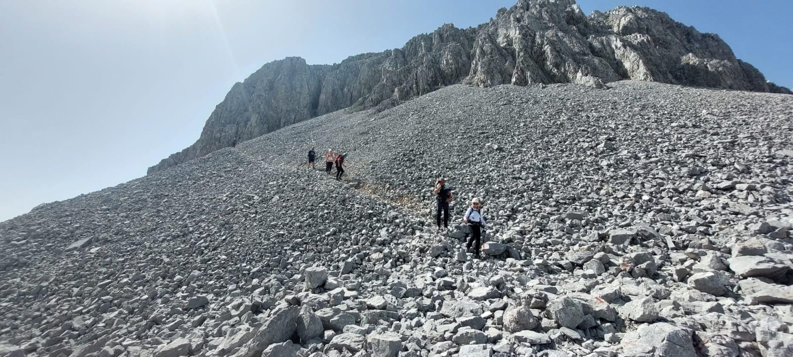 Sljedeće smo jutro, nakon kave, bogatog doručka i Tetkinih uštipaka, započeli uspon od 3 ipo sata do vrha Kučki kom. Zaputili smo se direktno iz smještaja, prolazili smo šumom, siparom, još jednom šumom, siparom, planinskim proplankom, sve do strmog uspona prema samom vrhu i kamenjaru. Vrućina nas je tjerala na češće stanke i pokušaje skrivanja u hladu, stoga se naš uspon produžio na 5 sati. Kada smo došli pred sam vrh, napravili smo malo veću stanku kako bi skupili snagu i hrabrost za prelazak tehnički najzahtjevnijeg dijela ture.