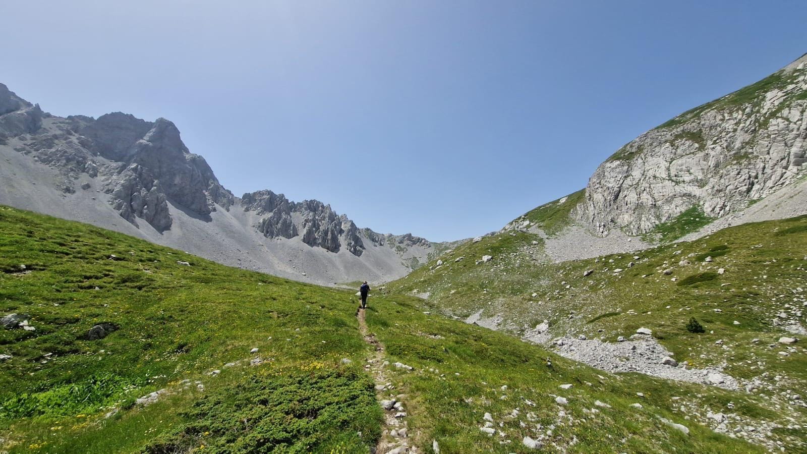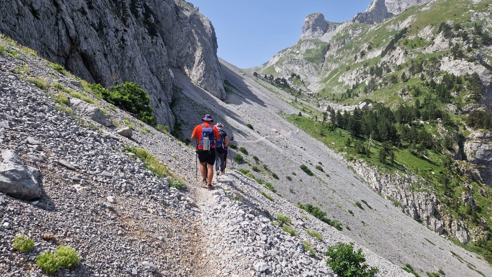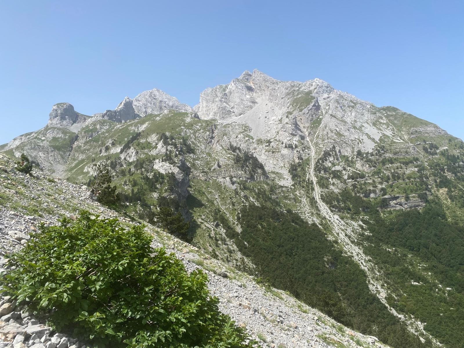 Sljedeće smo jutro, nakon kave, bogatog doručka i Tetkinih uštipaka, započeli uspon od 3 ipo sata do vrha Kučki kom. Zaputili smo se direktno iz smještaja, prolazili smo šumom, siparom, još jednom šumom, siparom, planinskim proplankom, sve do strmog uspona prema samom vrhu i kamenjaru. Vrućina nas je tjerala na češće stanke i pokušaje skrivanja u hladu, stoga se naš uspon produžio na 5 sati. Kada smo došli pred sam vrh, napravili smo malo veću stanku kako bi skupili snagu i hrabrost za prelazak tehnički najzahtjevnijeg dijela ture.